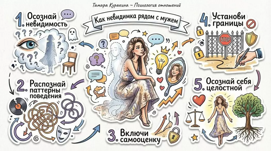 «Мой муж смотрит сквозь меня, как будто я просто невидима. Я готовлю, убираю, общаюсь — но он молчит и не замечает, и это заполняет меня чувством пустоты». В этой статье рассмотрим, как Лариса прошла путь от ощущения невидимости к осознанию своей цельности, следуя пяти ключевым шагам.