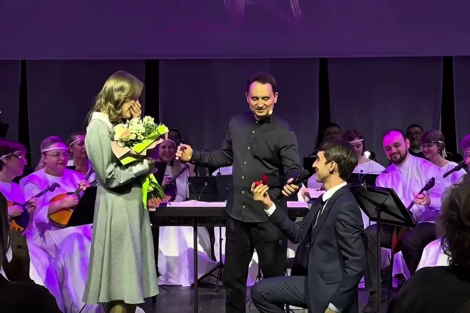 После этих слов парень пригласил свою возлюбленную Анну на сцену, подарив ей пышный букет цветов, и, не медля, сделал предложение. В этот момент весь зал наполнился атмосферой любви и счастья.